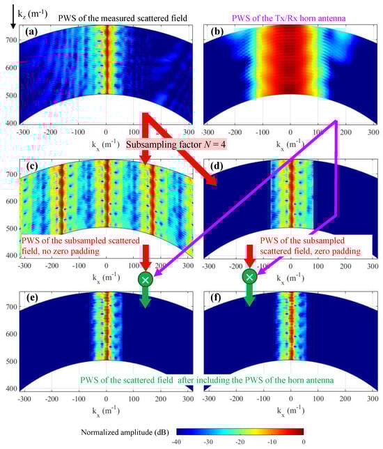 Representation of the PWS for different measurements and methods. (a) PWS of the measured scatterd field. (b) PWS of the Tx/Rx horn antenna. (c) PWS of the subsampled scattered field, no zero padding. (d) PWS of the subsampled scattered field, zero padding. (e) PWS of the subsampled scattered field (without zero padding) after multiplying it by the PWS of the horn antenna. (f) PWS of the subsampled scattered field (with zero padding) after multiplying it by the PWS of the horn antenna.