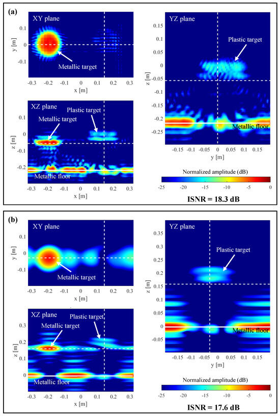Imaging results for the measurement setup depicted in Figure 11a. XY, XZ, and YZ cuts are centered at the location of the targets. The plane z = 0 m corresponds to the actual position of the flat metallic floor. (a) Conventional Fourier-based imaging. (b) Fourier-based microwave imaging when the PWS of the horn antenna is considered. Dashed white lines on each plane denote the position of the other two planes (e.g., XZ plane and YZ plane in the case of the XY plane representation).