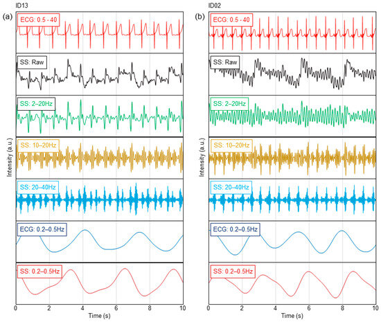 From the results of ID13 in Figure 2a, a clear BCG can be observed by bandpass filtering at 2–20 Hz. The BCG peak is delayed approximately 0.15 s from the R-peak in the ECG in Figure S1a. The BCG waveform was obscured by bandpass filtering at 10–20 Hz, whereas two peaks were observed within one beat. As heart sounds are generally observed in the frequency range above 20 Hz, these peaks are considered to be low-frequency components corresponding to the first sound (S1) and second sound (S2) of the heart [33,34,35,36]. From the waveform filtered at 20–40 Hz, a PCG can be clearly obtained (Figure S1a). In this case, the peak delay of the PCG against the R-peak in the ECG decreased to approximately 0.06 s. The respiratory waveform can be clearly observed by filtering at 0.2–0.5 Hz. Comparing the respiratory waveforms extracted from the ECG, the amplitude periods were similar. From this result, it was confirmed that the respiration waveform could be measured by the sheet sensor. The background noise that increased and decreased simultaneously with the breathing cycle observed in SS at 20–40 Hz in Figure 2a indicated breathing sounds. The timing of the breath sounds coincided with the amplitude phase of the respiratory waveform.
