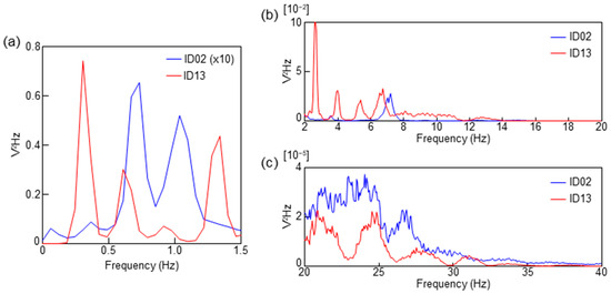 PSD spectra calculated from the sheet sensor data for ID13 and ID02. (a) PSD of the frequency range of respiration. The intensity of ID02 was multiplied by 10 in (a). (b) PSD of the frequency range of BCG (2–20 Hz). (c) PSD of the frequency range of PCG (20–40 Hz).