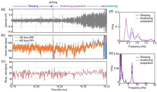 Figure 5d,e show the results of PSD during 10 min of sleeping (14:13–14:23) and in the awakening preparation stage (14:24–14:34), respectively. The calculations in Figure 5d,e are based on the same procedure as that in Figure 3. The PSD data of sleeping (14:13–14:23) shown in Figure 5d,e are equal to those of ID02 in Figure 3a,b. As a result of comparing the PSD before and after jerking, a shift in the PSD peak can be observed in Figure 5d, indicating the frequency band of respiration. During sleep, PSD peaks were placed at 0.7 and 1.1 Hz. After jerking, the PSD peaks shifted to 0.3 and 0.7 Hz. This change corresponded to an increase in respiration amplitude during the awakening preparation stage, as shown in Figure 5a. The PSD peaks corresponding to the BCG band of 2–20 Hz in Figure 5e showed no significant change before and after jerking.
