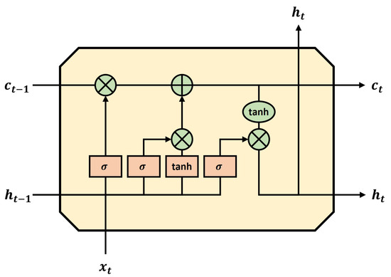 Representation of an LSTM cell. Here, h and c denote the vectors of the hidden layer, x represents the input, t stands for the current time step, and − 1 indicates the previous time step.