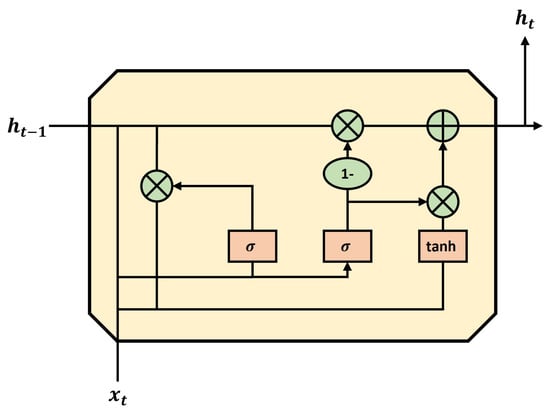 A GRU cell is a simplified model of the LSTM cell. In the LSTM cell, two state vectors are combined into a single vector [46,47,48]. This controls the part to be deleted as well as the part to receive input with one inner layer. Similar to the LSTMs, the output is determined using the sigmoid activation function. When the output is 0, the delete part is closed and the input part is open. When the output is one, the delete gate is opened and the input gate is closed, thereby determining the direction of delivery. Unlike the LSTM, the GRU cell does not have an output part; therefore, the entire state vector is the output for each time slot. A new layer is added to control the outputs of the previous state. The GRU is a simplified and faster version of the LSTM. In this paper, the LSTM and GRU are combined into an advanced model; the accuracy and speed tests were conducted for each layer number and model type. An illustrative depiction of the LSTM cell highlights its intricate mechanisms and flow of information. Moving on to Figure 2, we present the GRU cell, outlining its distinctive architecture and highlighting the dynamics of its functional elements.