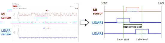 A light detection and ranging (LiDAR) sensor (Device name [SJ-PM-TFmini Plus-T-01 A01], Benewake (Beijing) Co., Ltd., Haidian District, Beijing, China) [49,50] was used to accurately label the position of metal objects after data acquisition. Labeling, as represented in Figure 5, was performed based on the information obtained from the LiDAR sensors, which were installed on the front/rear side of the MI sensor. The LiDAR sensor measured the distance between the sensor and the object in the vertical direction. The data on the floor were labeled as 0, and, in the case of classification data, from 1 to 5 for each object, and 1 for the metal object for detection data. The labeling criterion was set as the start and end of the signal of the MI sensor for the metal object with the position of the object detected by the LiDAR sensor as the center.