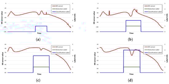 Figure 6 illustrates the MI sensor data, which are automatically labeled through the LiDAR sensor. The curve-like nature of the data arises because our test rig performs a circular motion. While in operation, the MI sensor retains its default and base signal values, and during this circular motion, influences from the MI sensor cause the recorded values to trace a circular shape. The red line indicates the MI sensor data, the green line is the labeling value acquired by detection, and the blue line is the labeling value obtained through classification. The label value assumes ‘0’ when no metal object is present and ‘1’ when a metal object is present, ensuring accurate detection results. In terms of classification, each type of metal model was assigned a number from ‘1 to 5’, with ‘0’ representing the absence of any model.