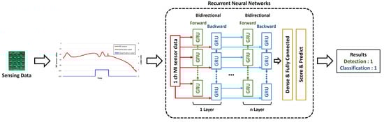 The detection performance was better in the forward LSTM and GRU with general learning. It was confirmed that forward learning was more advantageous because detection judged similar patterns as a single signal rather than recognizing each similar pattern. In recognition and classification performance, LSTM- and GRU-Bidirectional learning with the reverse order of sequence data showed better performance compared to the forward LSTM and GRU that were trained normally, and the number of parameters was not increased. In addition, the detection performance of the interactive model was also high. Accordingly, it was confirmed that the interactive model showed better performance. Thus, it was deemed suitable for real-time data processing.
