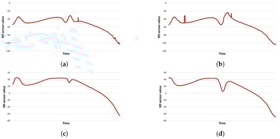 For dataset configuration, the measurement speed was set to 1 m/s, 3 m/s, and 5 m/s, and the distance between the sensor and the object was set to 20 cm, 30 cm, and 40 cm, respectively, for each measurement speed. All of the data acquisition frequencies of the MI sensors were the same. The data were acquired 20 times for each distance and speed. There are three distances and speeds, respectively, and a total of nine measurement methods are used. The data were measured 20 times in nine different ways and 180 times for each metal model. The dataset configuration for deep learning and verification was carried out through a total of 900 data acquisition processes. All of the acquired data were in the csv file format. Figure 6 provides a visualization of some of the constructed data.