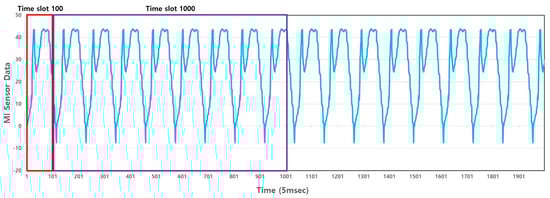 We compared the performance of RNN models according to time series units. The RNN model for analyzing time series data learns by grouping data based on their length rather than learning one by one. Accordingly, the continuity and interrelationship of signals are learned. This constant length is called a time slot, and the learning length affects the accuracy of the RNN model. If the time series unit is shorter than the period of the signal, the regularity of the signal may become ambiguous, and the accuracy may be lowered. In this paper, the optimal time series unit was analyzed by varying the length of the time series unit. Figure 9 presents an example of the time series unit.
