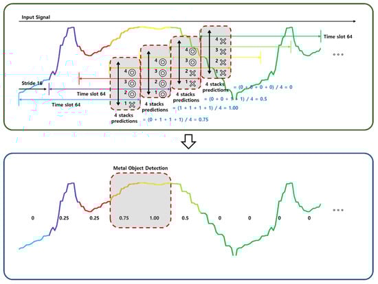 To be more specific, we divide the input data into regions of interest and perform up to four overlapping predictions for each region. The double circles represent instances where the deep learning model infers the presence of a metallic object, while the ’X’ denotes its absence. For each signal region, detection is performed four times. This is achieved by moving a filter with a length of a quarter of the predicted signal, resulting in four detections for a single area.