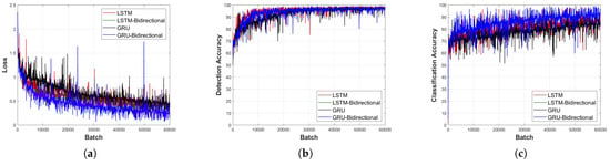 The model was hardly trained in the first layer of the four models, most of the signals were predicted as 0, and it was confirmed that a numerical value such as the null accuracy was obtained. The LSTM-Bidirectional model exhibited the highest accuracy of classification and a recognition rate of 95.93%. The LSTM model exhibited the highest accuracy of detection at 98.09%. The classification accuracy of the LSTM model was 87.44%, which is relatively low. However, the detection rate of the LSTM-Bidirectional model was 97.9%, which was 0.19% less than that of the LSTM, and showed a high accuracy. The LSTM-Bidirectional model is excellent for both detection and recognition and is suitable for practical use. The next best performing model is the GRU-Bidirectional model. Respectively, the detection rate and recognition rate are 97.6% and 95.51%. There was a slight difference in the numerical accuracy, and, since the GRU-Bidirectional model exhibited the highest inference speed, it was judged that there was no problem in adopting the GRU-Bidirectional model for an application that requires a higher speed.