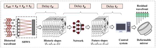 In conventional non-predicted AO systems, DM compensates for current wavefront distortion directly by loading historical wavefront information [3]. In order to improve the real-time correction capability, we adopt a deep learning-based method for multi-frame wavefront prediction to adapt to different delay errors at the condition of fSHWS < fATurb. The schematic diagram of an AO open-loop prediction correction system based on the distorted wavefront of atmospheric turbulence is shown in Figure 1. The AO system first uses SHWS to detect the wavefront aberration of atmospheric turbulence. Then, the NN prediction model predicts the wavefront aberration of the future time by taking the historical wavefront slope data as input, and the controller converts the predicted slope into the DM control voltage. Assuming that the time delay calculated by SHWS wavefront detection, NN prediction and wavefront controller processing is td, tp and tc, respectively, then the total time error from the detection of wavefront aberration to the completion of phase correction are the sum of the three. If the NN can predict sufficient and accurate future slopes, then the corrected wavefront loaded on the DM is the true distorted wavefront currently detected, and real-time compensation can be completed.