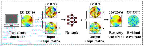 Different D/r0 represent different turbulence intensities. We chose 10,000 sets of slope datasets for each of the five different D/r0 to train our model, so as to improve the generalization ability of the network. The dataset is divided into training and testing dataset in a 4:1 ratio. Specifically in this paper, for the images in the dataset, the first 10 frames are taken as the input, and frames 11–16 are taken as the label of the network to form a training pair. In the atmospheric simulation, we simulated the wavefront phase, but in the network model training, we selected the wavefront slope data, which is more easily obtained in the actual AO system and has a smaller dimension; that is, the input for each time is the centroid displacement in the x and y directions of the SHWS subaperture array, the input dimension is 16 × 16 × 2 × 10, and the output dimension is 16 × 16 × 2 × 6. The input/output settings are shown in Figure 2, in which recovery wavefronts are used as true wavefront for subsequent predictive performance tests.