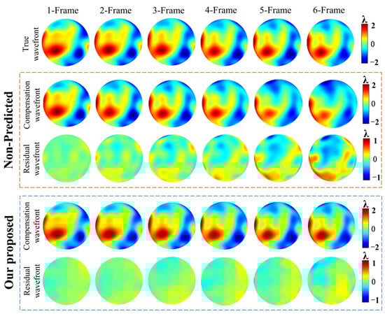 At the sampling frequency of 500 Hz, compared with the non-predicted methods, our proposed prediction network shows obvious open-loop compensation advantages. As shown in Figure 5, we show the compensation results of our proposed method and non-predicted method for random consecutive 6 frames of true wavefront under the condition of 1–6 frame delay, respectively.