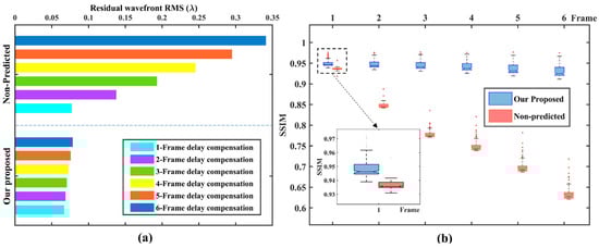 For a quantitative and more intuitive representation, we show the average compensation results for 100 sets of six frames consecutive true wavefront, as shown in Figure 6. In Figure 6a, it can be seen that with an increase in the number of delay frames, the prediction accuracy of our proposed method gradually decreases, but compared with non-predicted methods, it still shows higher prediction stability. When the number of delayed frames is 2, the prediction accuracy is improved by 50.2% compared to the non-predicted method; when the number of delayed frames is 4, the prediction accuracy is improved by 70.3%; and when the number of delayed frames is 6, the prediction accuracy is improved by 77%. It is proved that our proposed prediction network is effective in the actual AO delay system, and the system with more delay frames has greater performance improvement. In Figure 6b, it can be seen that as the number of delayed frames increases, the SSIM value of non-predicted methods decreases rapidly, while the SSIM of our proposed method remains stable above 0.9, which further verifies the prediction accuracy and stability of our proposed method.