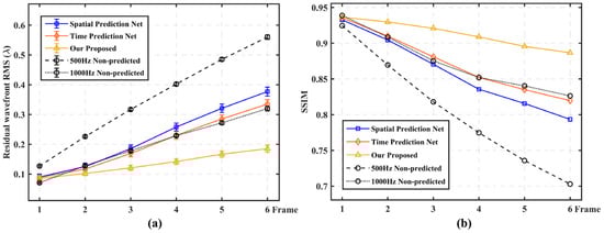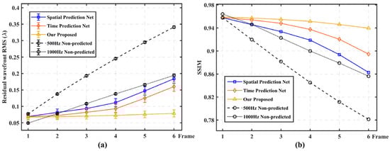 When the sampling frequency is 500 Hz, the system delay is about 4–6 frames. Therefore, we quantitatively demonstrate the performance improvement of our proposed prediction method, spatial prediction network and time prediction network compared with 500 Hz non-predicted method and 1000 Hz non-predicted method, respectively, under the delay conditions of four-frame and six-frame. As shown in Table 1, it can be seen that our proposed method has more obvious compensation advantages. Moreover, the prediction accuracy based on RMSe of the proposed for the next six frames of wavefront decreases by no more than 15%, which shows a high prediction stability.