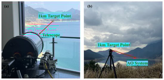 Schematic diagram of a 1 km laser atmospheric transmission system. (a) The perspective of the receiving end (AO system). (b) The perspective of the transmitting end (target pure cooperative target light source).