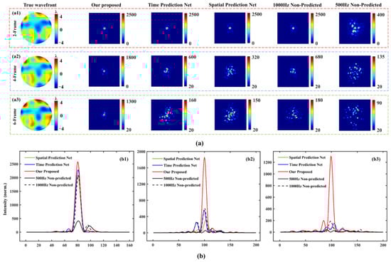 Furthermore, we recorded the far-field of the true distorted wavefront to be corrected under the conditions of two-frame, four-frame and six-frame delay by using our proposed method, 500 Hz non-predicted method, 1000 Hz non-predicted method, spatial prediction and time prediction network. As can be seen from Figure 10a,b, regardless of the delay condition, the energy of our proposed method is more concentrated after open-loop compensation. From which it can be found that under the delay conditions of two-frame, four-frame and six-frame, the maximum intensity of the far-field focus of our proposed is about 6.2 times, 13.8 times and 14.1 times of the 500 Hz non-predicted method, and 1.2 times, 2.7 times and 6.9 times of the 1000 Hz non-predicted method after open-loop correction, respectively. It is quantitatively proved that our proposed prediction method can obtain better open-loop correction results under the condition of low sampling frequency than the traditional non-predicted method with high frame frequency sampling.