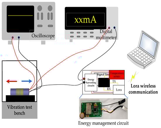 In order to evaluate the output capability of self-powered wireless sensors after long-term operation, an experimental platform was built as shown in Figure 4, consisting of a vibration energy harvester, energy management circuit, vibration table, oscilloscope, and digital multimeter. Firstly, the vibration energy harvester was installed on the vibration table, which vibrated back and forth at a speed of 270 mm/s. Then, the digital multimeter was connected to the circuit in a series to measure the output current of the vibration energy harvester, while the oscilloscope was used to measure the voltage value at the moment. The temperature sensor was used to collect the temperature of the indoor environment, and transmits the data to the PC through the Lora wireless communication module for data storage. Among them, the test platform ran for 4 h a day, and a total of 200 h of data needed to be collected. The index parameters of the self-powered wireless sensor were measured every two hours, and the test location was Chongqing University, from June to July 2022.