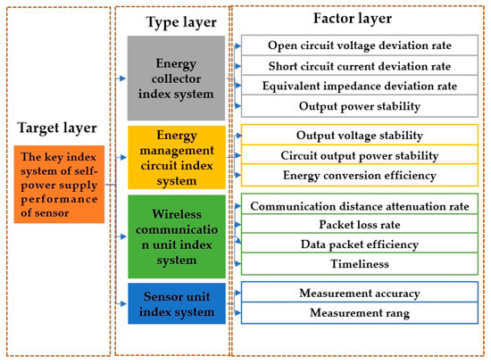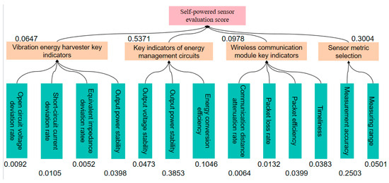 After the above analysis, the self-powered wireless sensor evaluation index system composed of the target layer, type layer, and factor layer was constructed as shown in Figure 6. Among them, the target layer is a Level 1 indicator, which is the evaluation result, used to provide the operational status of self-powered wireless sensors. The type is a Level 2 indicator, which is the type of evaluation, including the energy collector indicator, energy management circuit indicator, wireless communication unit indicator, and sensing unit indicator, used to classify and manage various indicators in the factor layer. The factor layer is a specific evaluation indicator used for the direct evaluation of objectives.
