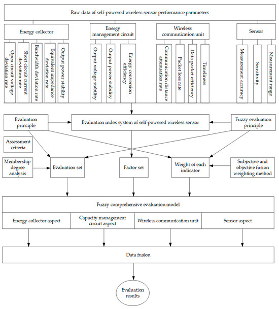 Self-powered wireless sensors have numerous operating status parameters, and the operating mechanisms of each part are affected by various factors. Among them, factors related to device health status are mostly characterized by ambiguity and uncertainty, especially for self-powered wireless sensors, there is currently no mature and available index system. Therefore, a fuzzy evaluation model was constructed as shown in Figure 8 to evaluate the operational status of self-powered wireless sensors. The main idea is that a fuzzy comprehensive evaluation is an evaluation method based on the fuzzy mathematics theory. This evaluation method borrows the concept of membership function from fuzzy mathematics, fuzzifying the traditional evaluation method of indexes with fixed values as boundaries, and constructing a membership matrix through the characterization of the membership function. The weight values of each factor are multiplied by the membership matrix to obtain the overall membership evaluation [33]. At the same time, a combination of subjective and objective methods was used to determine the weight values of each factor in order to balance the authority and objectivity of the determined weights.