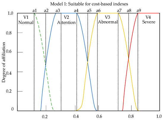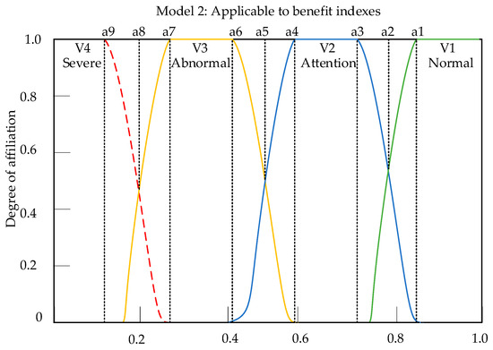 Next, it is necessary to classify the membership models of each index. The results of the membership models determined for each index in this article are shown in Table 8. The model classification in Table 8 was developed by experts from Chongqing University and then determined after consultation with experts from the State Grid of China.