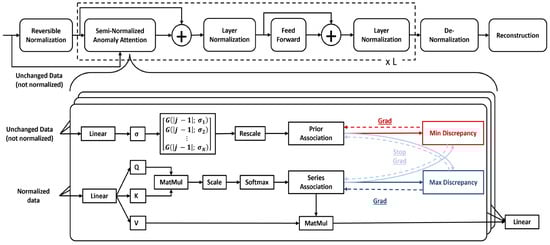 By focusing on the constraints of transformers and the achievement of the anomaly transformer in unsupervised anomaly detection, we enhanced the anomaly transformer to the reversible instance normalized anomaly transformer. We adopted the anomaly transformer [] as it addresses the challenge of the adjacent inductive by introducing the prior association and series association of each time point. We also leveraged the concept of the reversible normalization and rethought the anomaly transformer for the same application. This architecture estimates the anomaly score based on the association discrepancy and reconstruction error. The association discrepancy considers the prior association and series association of each time point. The prior association employs the learnable Gaussian kernel to present the adjacent concentration inductive bias of each time point. The series association corresponds to the self-attention weights learned from raw series. We renovated the anomaly transformer by adding the reversible instance learnable normalization to input time series data because anomalies are rare and normalization might reduce the impact of anomalies. Thus, normalization was only applied to the series association part, as shown in Figure 1. This partial application of the reversible instance normalization brings to light the variations between the series associations and the prior associations while determining the association discrepancies. As in the anomaly transformer, we utilized an encoder-only design, with stacks of specially designed attention blocks and feedforward layers. These stacks are repeated multiple times. However, the attention block is different from the anomaly attention block.