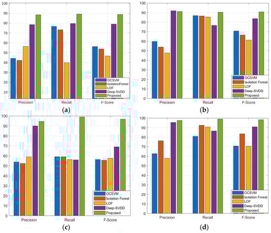 Comparison of proposed model with four different models in group4 classifiers using four different datasets: (a) SMD; (b) MSL; (c) SMAP; (d) PSM.