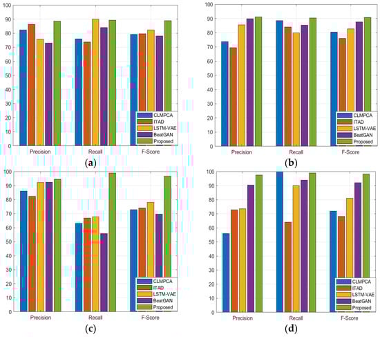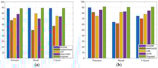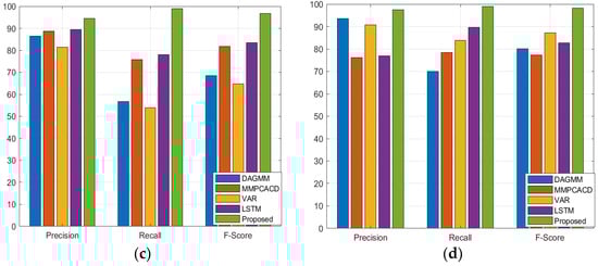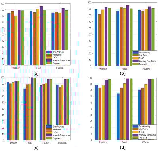 Table 1 shows the quantitative comparison of the precision, recall, and F1 scores for the 16 other baseline models and the suggested model. We can see that although the performance of the suggested model is comparable to that of the anomaly transformer in the SMD, MSL, and SMAP datasets, it is better than that of the state-of-the-art anomaly transformer in the PSM dataset. Figure 2, Figure 3, Figure 4 and Figure 5 show the comparisons of the precision, recall, and F1 scores, respectively. The proposed model outperforms almost all the existing algorithms except for the anomaly transformer.