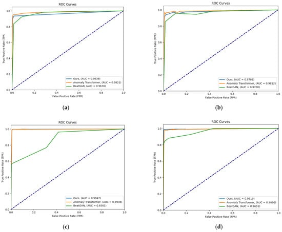 With the MSL data, the proposed model shows a slightly lower performance compared to that of the anomaly transformer, especially in terms of the precision and F1 scores. Although the performance of the proposed model is impressive and slightly better than that of the anomaly transformer, with an F1 score of 98.28, we can see that the performance of the proposed model is very comparable to that of the anomaly transformer. The F1 scores are almost the same, indicating a similar overall performance in this dataset. The proposed model seems to show a drop in performance, especially in terms of the recall and F1 scores, compared to those of the anomaly transformer. The anomaly transformer tends to perform better than the proposed model in the MSL and SMD datasets in terms of the F1 score, while the proposed model has a slight edge over the anomaly transformer in the PSM dataset. Both models perform similarly in the SMAP dataset. The proposed model consistently shows higher precision than the anomaly transformer in all the datasets, but it tends to have a lower recall score than the anomaly transformer in the MSL and SMD datasets. Figure 6 shows the ROC curves for the suggested model architecture alongside the ROC curves of the anomaly transformer and BeatGAN architectures. The AUC values of the suggested model architecture in the SMAP and PSM datasets seem to be better than those of even the anomaly transformer architecture. Additionally, for the MSL and SMD datasets, even though the proposed model architecture does not outshine that of the anomaly transformer, the AUC values are comparable.