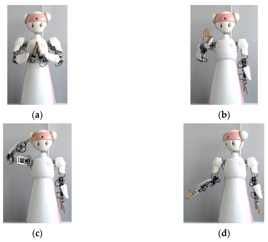 Namo’s main emblematic gestures used in this study: (a) Wai (or Thai greeting), (b) Bye, (c) Salute, and (d) Side Invite.
