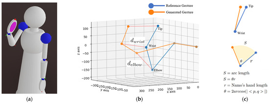 where d is the Euclidean distance between the 3D space position of the reconfigured joint angle and that of the reference joint angle of the gesture. Greater distance expresses less similarity to the reference gesture. The Euclidean distance is used for the elbow, wrist, and fingertip components. Figure 3b illustrates the frame-based model of Namo’s right arm in simulation, as shown in Figure 3a; the reconfigured gesture of Namo’s right arm is shown in orange, while the reference gesture is shown in blue. The orange dotted line denotes the distance vector between the joint position of the reconfigured and reference gesture at the same component.