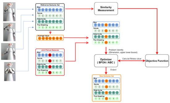 Once that joint failure occurs, the robot cannot control the failed joint to a desired angle. In this study, we proposed to lock the joint at a specific angle. We determined the locked angle by averaging the joint angles of that failed joint from all reference emblematic gesture sets; the average joint angle could potentially be a less restrictive constraint to the robot system to regenerate a good gesture reconfiguration of the remaining joints for all emblematic gestures. Under the constraint that the joint angle of the failed joint is locked at a specific angle, the bio-inspired artificial intelligence methods, e.g., genetic algorithm (GA), bacteria foraging optimization algorithm (BFOA), and artificial bee colony (ABC), are used as optimizers to generate joint angle sets of the remaining joints and determine a good joint reconfiguration solution that minimizes the difference between the reconfigured gestures and the reference gestures. The similarity to the reference gesture set is the objective function for the joint failure recovery problem; the greater similarity indicates the better joint reconfigured solution. We used the proposed gesture similarity measurement in (1) as the fitness evaluation of the generated joint reconfiguration. After running iterations of bio-inspired artificial intelligence methods, the reconfigured gesture sets were obtained. Figure 4 illustrates the process of the gesture reconfiguration methods with single reference sets. Joint reconfiguration can be conducted separately for each emblematic gesture.