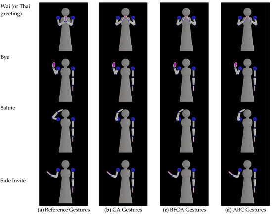 The emblematic gestures expressed by the Namo robot in simulation: (a) the reference gestures, (b) the output gestures from GA, (c) the output gestures from BFOA, and (d) the output gestures from ABC.