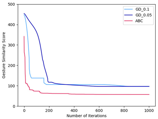 The comparison between gesture similarity scores from gradient descent (GD) and ABC algorithms over the iterations.