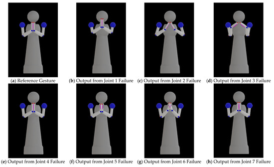 Joints 1–3 are located in the shoulder area and are designed to control the movement of the robot’s upper arm. Joint 1 is responsible for controlling the upper arm to swing forward and backwards. Joint 2 controls the upper arm to swing up and down to the side of the robot. Joint 3 controls the upper arm to rotate inward and outward from the robot’s body. When one of these joints fails, it affects all the components along the arm. The results in Table 6 show that the minimum difference values of the reconfigured outputs when the joints in this area failed were greater than those when other joints failed for all gestures. The boxplot in Figure 8 also confirms that when either of the joints in this group failed, the distance values between the reconfigured outputs and reference gestures of all components became high. Among the joints in this group, Joint 3 seemed to cause problems in performing the most emblematic gestures when it failed.