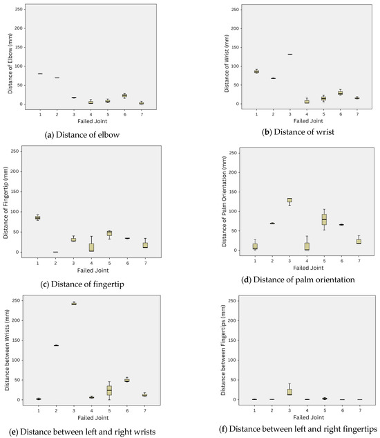 Considering the resulting gesture similarity measurement from all possible joint failures, we found that the strategy to lock the failed joint at some specific joint angle had an immense impact on the success of performing the emblematic gestures. The average joint angle from all gestures may not always be suitable. We analyzed the distance of each component of the robot arm in all best-reconfigured gestures when each failed joint occurred. Figure 8 illustrates the boxplot of all distance components in the gesture similarity measurement in (1) and (2) for all possible joint failures. Note that the distance components of the elbow, wrist, fingertip, and palm orientation, as shown in Figure 7a–d, are calculated for all emblematic gestures in this study, but the distance components between the left and right hands, as shown in Figure 7e–f, are used for the Wai gesture only.