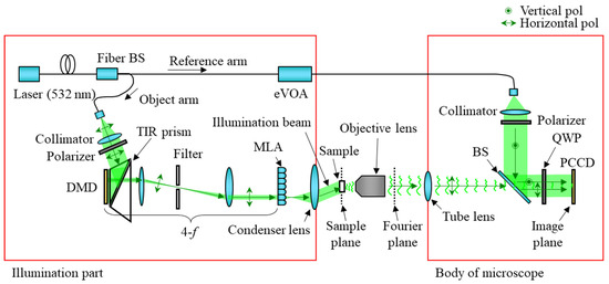Figure 2 shows our SA-DHM. A fiber beam splitter is used to distribute the beam in an optical power ratio of 99% for the object arm and 1% for the reference arm. The eVOA of Thorlabs on the reference arm controls the optical power from 0 to 5 V. The DMD has a resolution of 2560 × 1600 and a pixel pitch of 7.6 μm from Vialux. The 4-f optics consist of 2-inch diameter lenses with focal lengths of 100 mm and 150 mm, respectively. The MLA with a focal length of 3.26 mm and a lens pitch of 1.3 mm is made by Okotech. The condenser lens is an achromatic lens with an NA of 0.78, a clear aperture of 30 mm, and a WD of 6.6 mm. We used a 4× objective with an NA of 0.2 and a WD of 20 mm from Navitar and a 1× tube lens with a focal length of 200 mm from Thorlabs. The PCCD is an FLIR polarization monochromatic camera with a resolution of 2448 × 2048 and a pixel pitch of 3.45 um. A 1-inch QWP is placed directly in front of the PCCD to implement a parallel phase-shifting DHM [25].