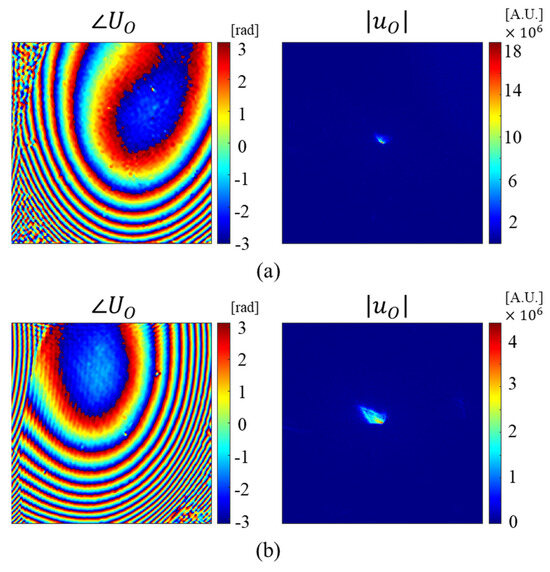 Experimental measurements of intensity phase profiles in focal plane and in Fourier domain. The measurements from the illumination beams are (a) = (122.1, −163.6, 11,808.3) and (b) (187.6, −164.6, 11,807.9).