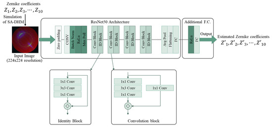Figure 4 shows the basic structure of the ResNet50, which consists mainly of identity blocks and convolution blocks. The identity block is the basic element that forms the ResNet50, and it uses shortcuts and residuals to reduce the effect of the gradient vanishing problem. The convolution block extracts more complex features from an input dataset, and, like the identity block, it concatenates and sums shortcuts with the output of the convolution layer. We used an image with the resolution of 224 × 224 as input data of the model in the ResNet50, as shown in Figure 4. One image was obtained from the simulation of SA-DHM with random Zernike coefficients and it had three channels which correspond to the intensity images in the Fourier domain, a focal plane, and an out-of-focus plane, respectively. A fully connected layer was added to the ResNet50 so that the ten lowest Zernike coefficients were predicted as an output.