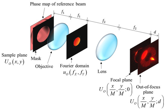 Digital holographic microscopy (DHM) is a technique for obtaining optical information of a sample by interfering the diffracted beam from the sample to be measured with a reference beam [1,2,3,4]. The great advantage of DHM is to understand the optical properties of a sample by measuring the intensity and phase of the diffracted beam from the sample. In addition, defects such as aberrations in optical elements or dust can be distinguished in the measured wavefront and the errors can be removed from the signal field to obtain more accurate information about the sample. Due to their many advantages, DHMs have been used in a variety of fields, including biological, microcircuit, and polymer characterization. However, DHMs also suffer from the same limitations as conventional optical microscopy, known as Lagrange invariance. In DHMs, Lagrange invariance represents the spatial bandwidth product (SBP) [5,6], which is the product of resolution and field of view, with the trade-off that higher resolution results in a smaller field of view.