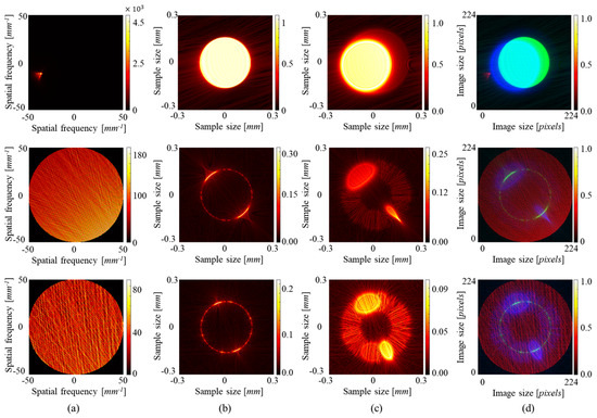Examples of the training data. The intensity patterns on (a) the Fourier domain, (b) the focal plane, and (c) the out-of-focus plane. (d) They are, respectively, occupied in R, G, B channels for training data. The pictures on the first line were numerically generated in the bright field condition and the others were numerically generated in the dark field condition.