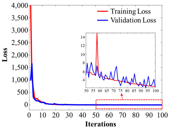 Figure 7 shows the loss function during training of the model with the training and validation data introduced in Section 3. After a total of 100 epochs, the final loss value was about 2.3. Due to the convergence of the validation loss and the training loss, it seems that the training was carried out effectively without overfitting. When we checked the prediction results performed in the middle of the process, it was difficult to predict Z0, which represents the piston phase, and the final loss value was mainly due to errors in this Z0 coefficient. The reason for the difficulty in accurately predicting Z0 is that the piston value represents an overall phase shift that does not significantly affect the intensity maps in both the frequency domain and image domain. Thus, it is difficult for the DNN model to learn any feature about Z0; therefore, it struggles with prediction.