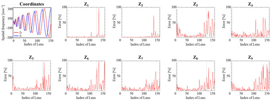 Prior to running the SA-DHM simulations, we generated illumination phase profiles using Zernike coefficients related to MLA and aberrations, corresponding to the lens positions xi and yi. A total of 153 illumination phase profiles were generated. Here, samples 1 through 5 represent the bright field, and others represent the dark field. Samples 6 through 121 were generated under the range of coefficients that was the same as the range of the training data. On the other hand, samples 122 through 153 were generated using coefficients with a larger range than the training range. This was performed to evaluate how accurately the model predicts results over a larger range. Using the generated illumination phase profiles and a circular aperture in SA-DHM simulations, we generated on the CCD plane, and calculated U0 using Equation (3). The calculated U0 was utilized to generate intensity maps in the frequency domain, the CCD plane, and out-of-focus plane, and these three types of intensity maps were combined into one BMP file. A total of 153 BMP files were generated. We predicted the Zernike coefficients using the trained model from these BMP files, and Figure 8 shows the spatial frequency of the illumination beam according to the lens index and the errors between the actual Zernike coefficients and the coefficients predicted by the trained model. For inputs up to 153, we saw the most error within 50% of the prediction results, and this means that the model has to be used within the training range. These results mean that it seems reasonable to use the predicted result in the range for the SA-DHM.