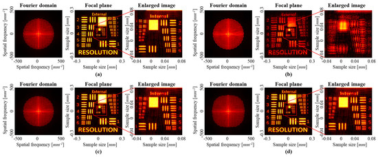 Figure 11 shows additional simulation results. In the simulation, the spoke resolution chart was used as the resolution target, and it had radial lines of which the line width increased far away from the center. Figure 11a shows the reconstruction result by using the ground truth of the Zernike coefficient. Figure 11b,c show the reconstruction results before and after aberration compensation. In the result before compensation, the lines beyond 0.15 mm away from the center are distinguishable. It is worthwhile noting that the lines around the region 0.07 mm away from the center become very sharp. This phenomenon meets the simulation of MTF chart in Figure 10, where there is a peak at 167 lp/mm. In the result after compensation, the region where the lines are distinguishable is a little smaller than that in ground truth. It is also expected from the MTF graph in Figure 10. In addition, the bandwidth of the spectrum in Fourier domain is limited in Figure 11. Therefore, the lines are blurred in the central region with the radius of 0.05 mm. This effect is also found in the MTF graph in Figure 10, where MTFs above 250 lp/mm fall abruptly.