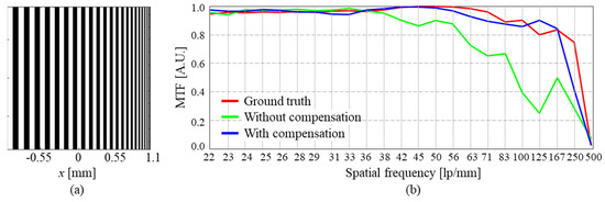 Figure 10 shows the resolution analysis. A linear MTF chart was used as the test target, of which the size increased gradually from 21 lp/mm to 500 lp/mm. It is noteworthy that the maximum resolution of this simulation was 500 lp/mm. The red line is the ground truth. The MTF of the red line is maintained above 0.8 until 167 lp/mm. The green and blue lines represent the MTFs of simulated results before and after compensating aberration, respectively. In the case before compensation, the MTF was maintained high just until 38 lp/mm, but after compensation, the MTF had a very similar tendency to that of the ground truth. In addition, the MTF of the red line decreased rapidly above the certain point of 250 lp/mm. The reason can be interpreted as follows. For example, if the signal is synthesized up to about 60% in the Fourier domain, the maximum resolution becomes around 312.5 lp/mm.