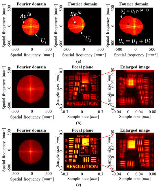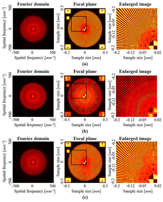 Aberration compensation in SA-DHM is critical for achieving high-resolution and accurate imaging, because the aberrations degrade the quality of reconstructed images significantly. Our proposed method, which involves training a DNN on Zernike coefficients and diffraction patterns obtained from a circular aperture, aims to address the challenges associated with compensating aberrations beyond the objective lens’ NA. Unfortunately, as explained earlier, the coefficient of Z0 cannot be predicted by the trained model because the diffraction pattern is not changed by the coefficient. Therefore, considering that Z0 is unpredictable, we made the phase of Fourier domain of the first wave function at a specific point in the overlapped regions match the piston phase, as shown in Figure 12a. If we perform SA-DHM without matching the piston phases, as shown in Figure 12b, the reconstructed image is severely distorted, and it is difficult to distinguish the original pattern. On the other hand, by compensating for the piston phase, as shown in Figure 12c, we obtain a reconstructed image with more clearly distinguishable patterns.