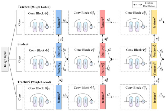 In the mathematical description, let denote the input image, denote the teacher network 1, denote the teacher network 2, and denote the student network. Let , , denote the k-th layer module of the teacher network and the student network. Let express the output of each layer of the three networks, where , , . is the number of feature layers that need to be distilled, are the channel number, height and width of the corresponding layer, and . The model is described as follows:
