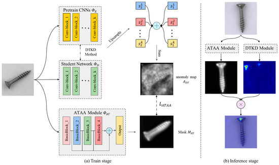 Figure 3 shows in detail how the attention mechanism works in training and inference. Figure 3a shows the process by which the ATAA module learns the areas that are prone to high anomalies in the image during training, where the DTKD method corresponds to the dual-teacher network distillation in Figure 2 and the ATAA module mainly learns from the distillation loss map generated during distillation. Figure 3b shows the process by which the ATAA module handles inference, where the mask generated by ATAA module is multiplied by bit with the anomaly map to filter out the background noise.