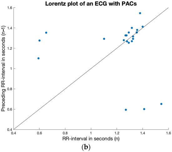 The Lorenz plot interpretation was performed very carefully, avoiding the detection of clusters within AF. Therefore, the threshold values for minimum distance between clusters were taken very widely to prevent accidentally detecting clusters in AF. Thus, in some cases, clusters were missed. An example of an ECG with undetected PVCs can be seen in Figure 5. However, in our study, there was only one ECG in the test set with PACs, PVCs, or AV block which was misdiagnosed as AF.