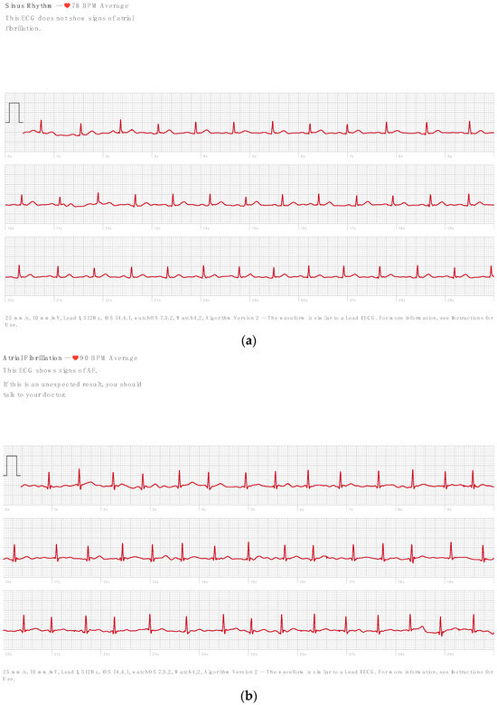 - Abu-Alrub, S.; Strik, M.; Ramirez, F.D.; Moussaoui, N.; Racine, H.P.; Marchand, H.; Buliard, S.; Haïssaguerre, M.; Ploux, S.; Bordachar, P. Smartwatch Electrocardiograms for Automated and Manual Diagnosis of Atrial Fibrillation: A Comparative Analysis of Three Models. Front. Cardiovasc. Med. 2022, 9, 836375. [Google Scholar] [CrossRef] [PubMed]